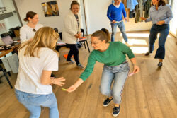 Bild: Teilnehmende an einem unserer Verkaufstrainings lernen auch Kundenwiderstände überwinden, hier mit unserer Übung „Wäscheklammern“ – äußerst hilfreich und auch noch lustig!