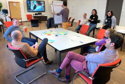 Im Bild sieht man einen Teilnehmer, der sich an der Flichart abmüht, während alle anderen sich lachend gemütlich zurücklehnen. Lerneffekt: anders ist besser!