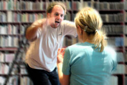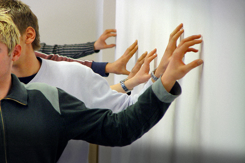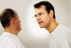Die Teilnehmer spielen abwechselnd aggressive Haltung und ruhige Reaktion.