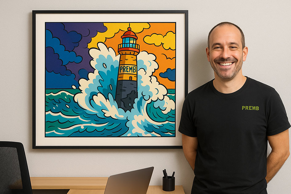 Dieser Chef lächelt über das Comic-Bild überwundener Krisen: Kein Sturm, keine Welle kann den Leuchtturm seiner Firma umhauen.