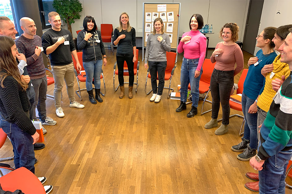 Teilnehmende bei einem unserer Trainings zur Körpersprache üben verschiedene Haltungen klar darzustellen.
