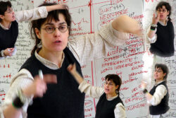 Bild: Vor den Vorhang treten und überzeugend sprechen – diese Teilnehmerin an einem unserer Trainings zeigt, wie es geht und überprüft beim Videofeedback, was am besten wirkt.