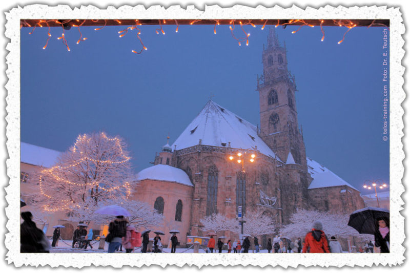 In der Zeit um Weihnachten überfällt uns gerne allgemeine Hektik. Muss nicht sein. Mit unseren Weihnachtskarten können Sie einen kleinen Gegenpol setzen. Bilder von Stille, Ruhe und Frieden. Eintauchen, freuen und träumen. Holen Sie sich hier gratis die heutige Weihnachtskarte und genießen Sie im Christkindlmarkt-geschmückten Bozen Dom, Schnee und Weihnachststimmung …