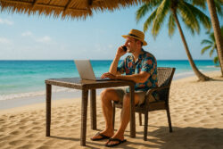 Urlaub Mann arbeitet Laptop Handy Strandbar Meer Palmen / Symbolbild: TELOS – TI250941830ck